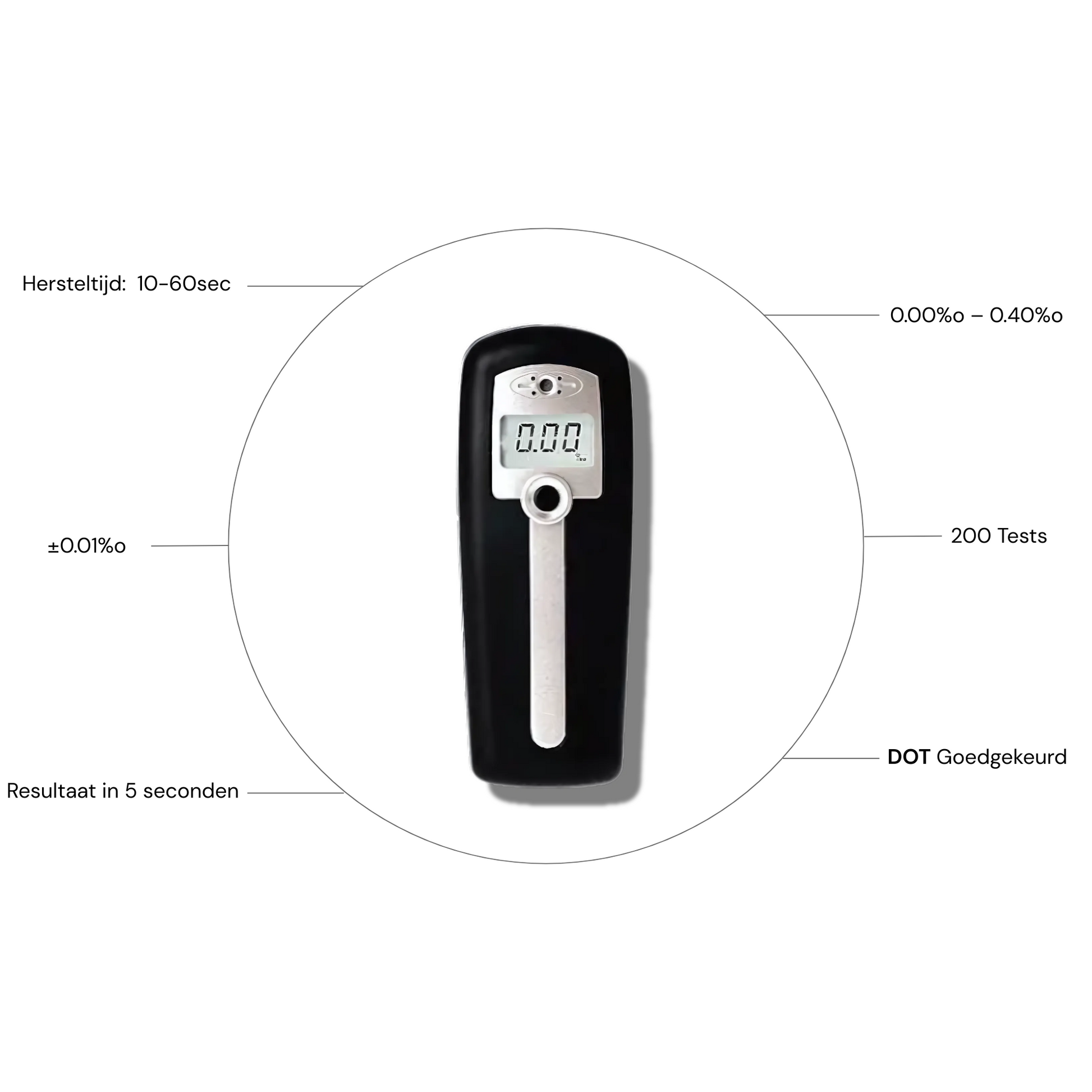 De Alcoscan AL2500 is een compacte, eenvoudig te gebruiken alcoholtester met een nauwkeurigheid van ±0.01% BAC. Dankzij de elektronische luchtstroomsensor meet hij snel en betrouwbaar binnen een bereik van 0.00%o tot 0.40%o. De tester is DOT-goedgekeurd, geschikt voor ongeveer 200 metingen en klaar voor gebruik met 3 mondstukken en 2 AA-batterijen inbegrepen.
