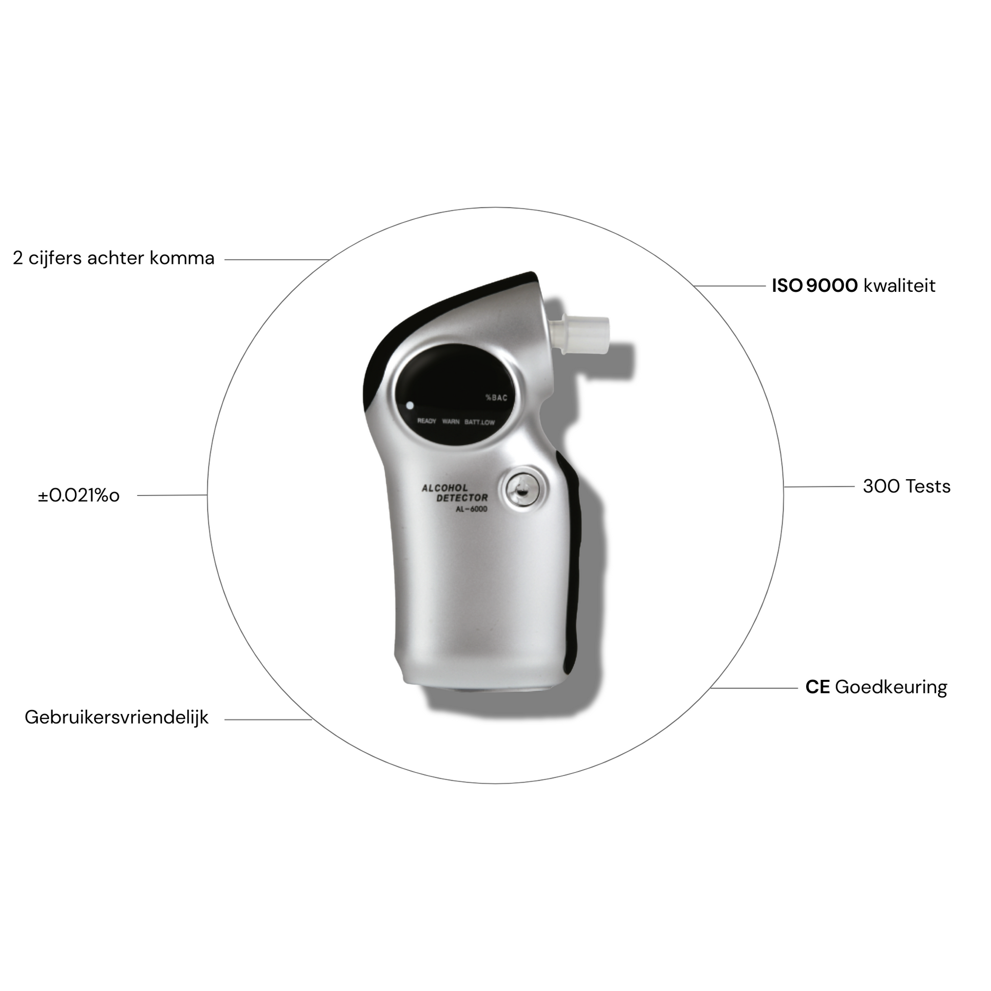 De Alcoscan AL6000 combineert professionele nauwkeurigheid met gebruiksgemak. Dankzij de hoogwaardige halfgeleider-sensor die eenvoudig zelf vernieuwd kan worden en de meetnauwkeurigheid van 95% (bevestigd door TU Wenen), ontvang je betrouwbare resultaten tot twee cijfers achter de komma.