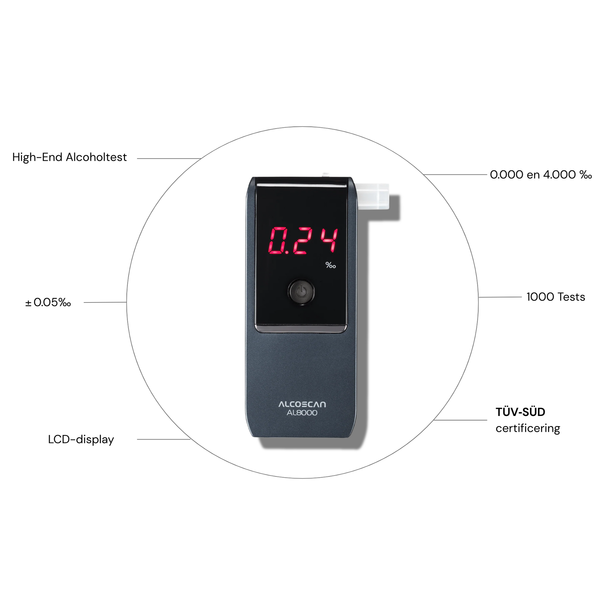 Met een duidelijk 3-cijferig verlicht LCD-display, ingebouwd uitschuifbaar mondstuk en een compact design van slechts ~66 g, is de AL8000 gemakkelijk mee te nemen en eenvoudig te gebruiken onder alle omstandigheden.
