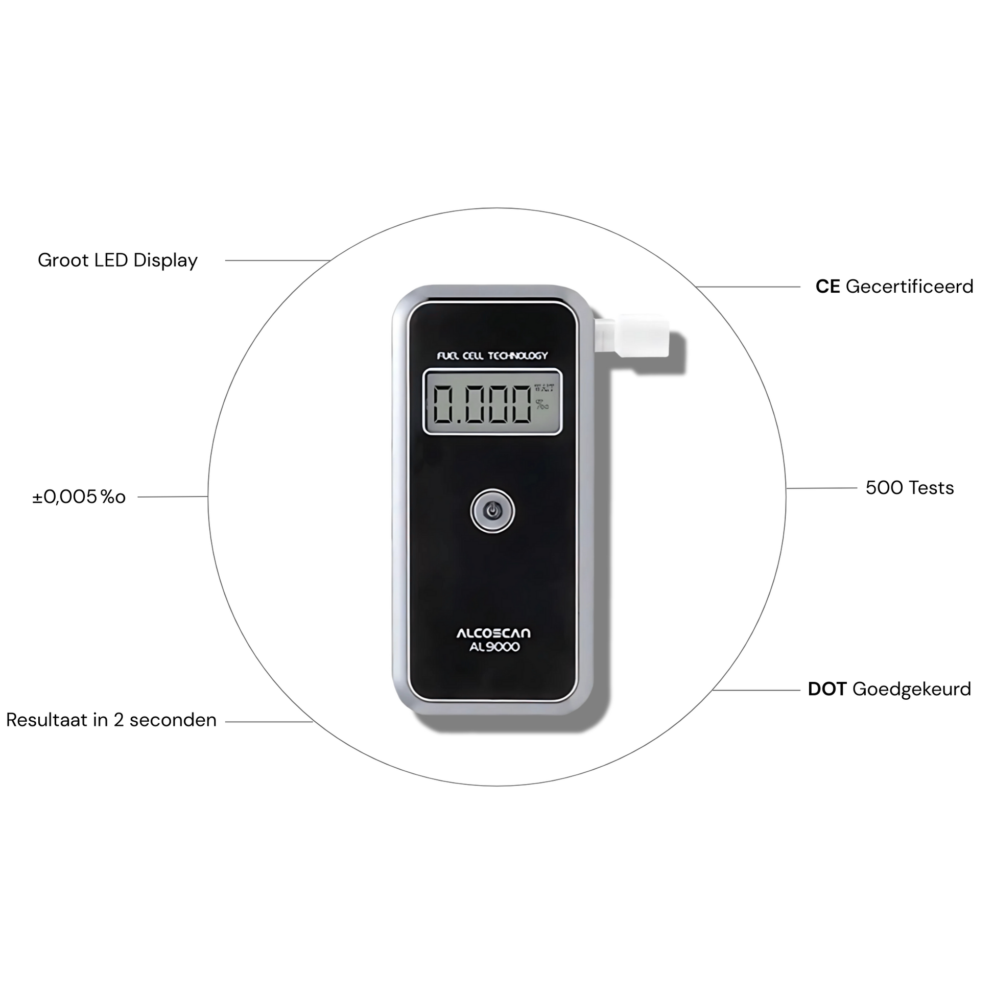 De Alcoscan AL9000 is een professionele alcoholtester met een geavanceerde fuel-cell sensor die buitengewone precisie levert (±0,005 %o bij 0,100 %o).