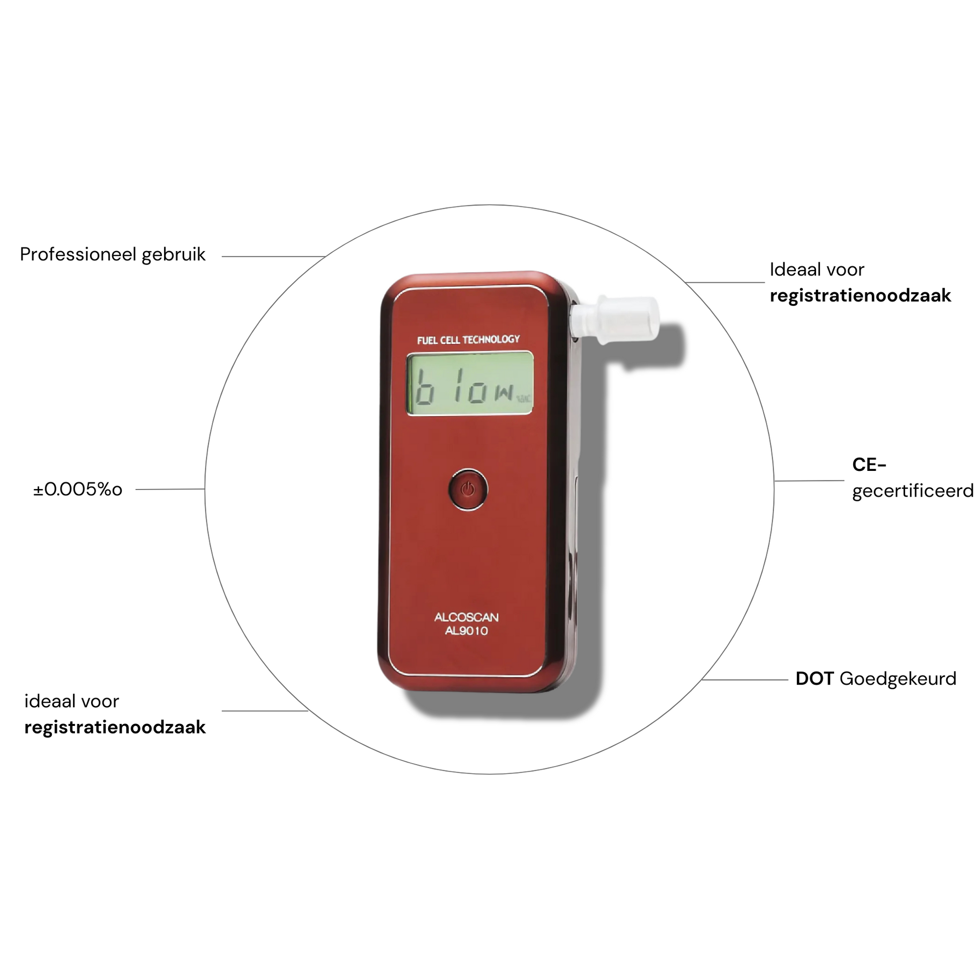 De AL9010 meet in promillage met een nauwkeurigheid van ±0.005% BAC, is voorzien van een helder LCD-display en automatische luchtstroomsensor voor correcte ademafname.